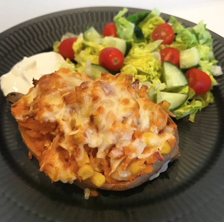 4. Fordel fyllet i søtpotetene og topp med revet ost. Stek i ovnen på 200 grader i ca. 15 minutter. Til osten er gyllen.