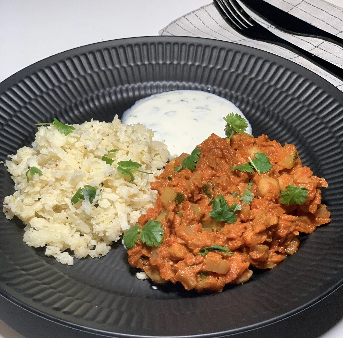 Kjempegod og smakfull indisk vegetargryte med blomkålris og yoghurtdressing