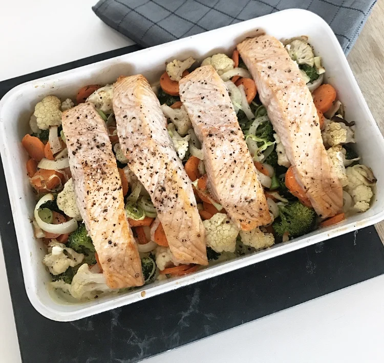 Kutt alle grønnsakene og legg i en ildfast form. Hell over matfløten og legg laksefiletene på toppen. Krydre med salt og pepper. (eller det krydderet du måtte ønske)